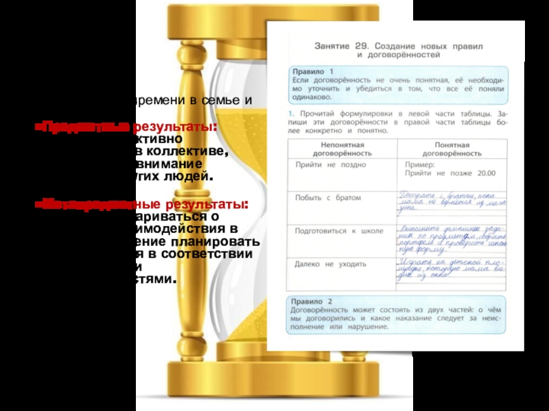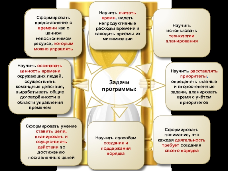 Научить осознавать ценность времени окружающих людей, осуществлять командные действия, вырабатывать общие договорённости в области управления временем