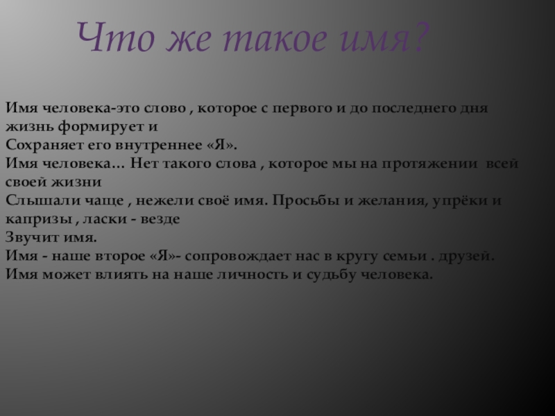 Что же такое имя?Имя человека-это слово , которое с первого и до последнего дня жизнь формирует и