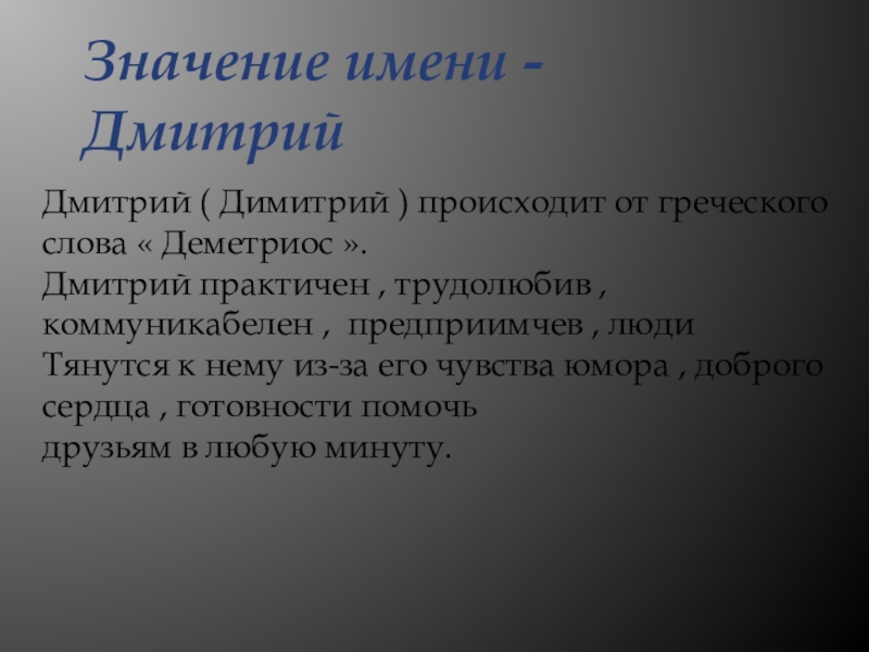 Значение имени - ДмитрийДмитрий ( Димитрий ) происходит от греческого слова « Деметриос ».Дмитрий практичен , трудолюбив
