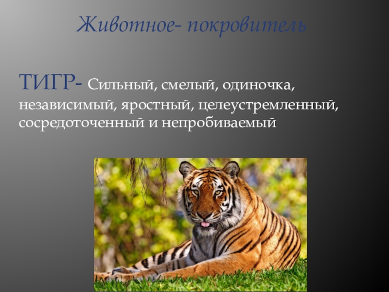 Животное- покровительТИГР- Сильный, смелый, одиночка, независимый, яростный, целеустремленный, сосредоточенный и непробиваемый
