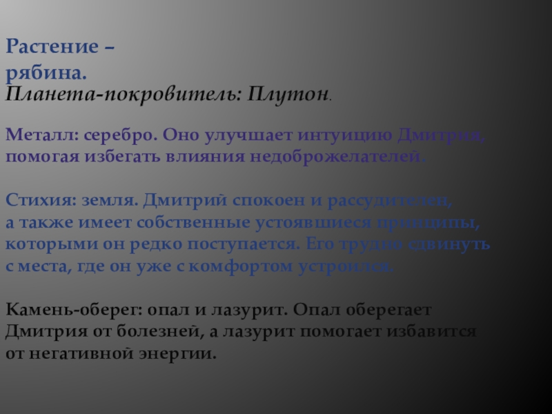 Растение – рябина.Планета-покровитель: Плутон.Металл: серебро. Оно улучшает интуицию Дмитрия, помогая избегать влияния недоброжелателей.Стихия: земля. Дмитрий спокоен и рассудителен, а также имеет собственные