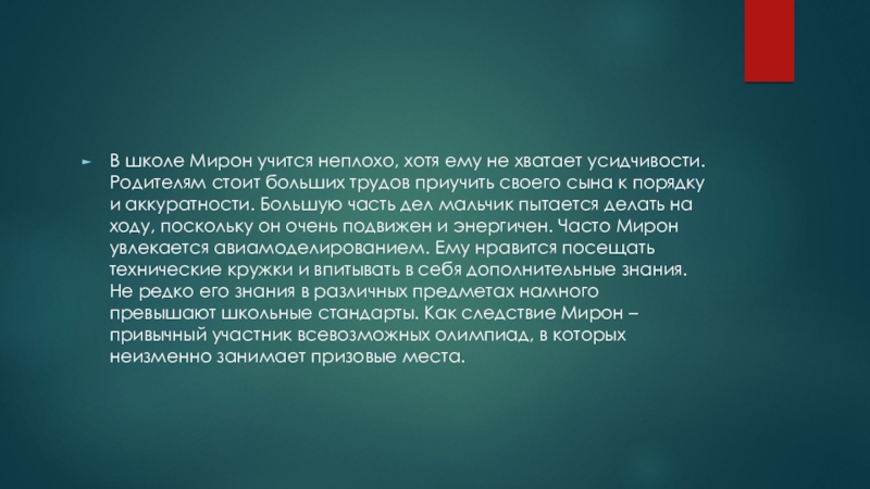 Слайд 16В школе Мирон учится неплохо, хотя ему не хватает усидчивости. Родителям