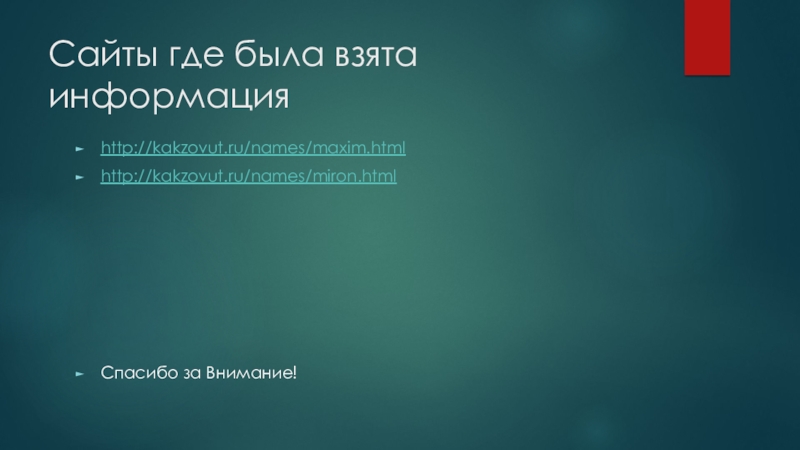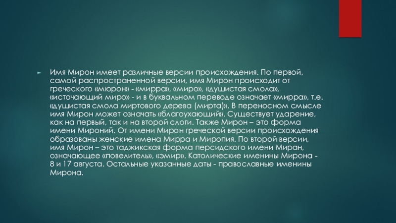 Слайд 14Имя Мирон имеет различные версии происхождения. По первой, самой распространенной версии,