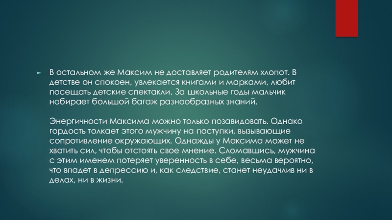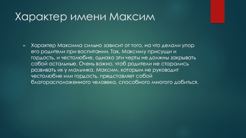 упор его родители при воспитании. Так, Максиму присущи и гордость, и честолюбие, однако эти черты не должны закрывать собой остальные. Очень важно, чтоб родители не старались развивать их у мальчика. Максим, которым не руководит честолюбие или гордость, представляет собой благорасположенного человека, способного многого добиться.