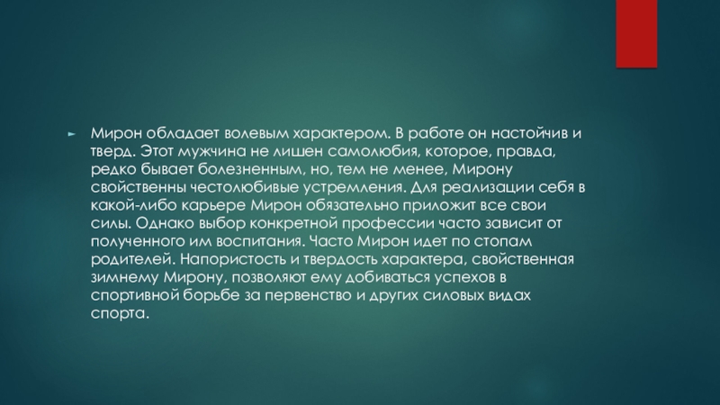Слайд 17Мирон обладает волевым характером. В работе он настойчив и тверд. Этот