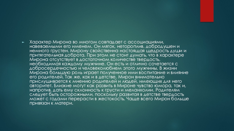 Слайд 18Мирону свойственны честность, обязательность и верность слову. Он пунктуален и не