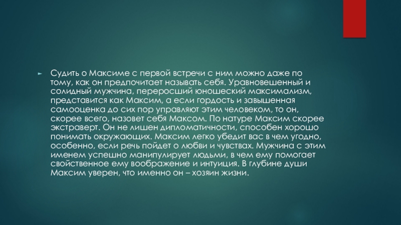 тому, как он предпочитает называть себя. Уравновешенный и солидный мужчина, переросший юношеский максимализм, представится как Максим, а если гордость и завышенная самооценка до сих пор управляют этим человеком, то он, скорее всего, назовет себя Максом. По натуре Максим скорее экстраверт. Он не лишен дипломатичности, способен хорошо понимать окружающих. Максим легко убедит вас в чем угодно, особенно, если речь пойдет о любви и чувствах. Мужчина с этим именем успешно манипулирует людьми, в чем ему помогает свойственное ему воображение и интуиция. В глубине души Максим уверен, что именно он – хозяин жизни.