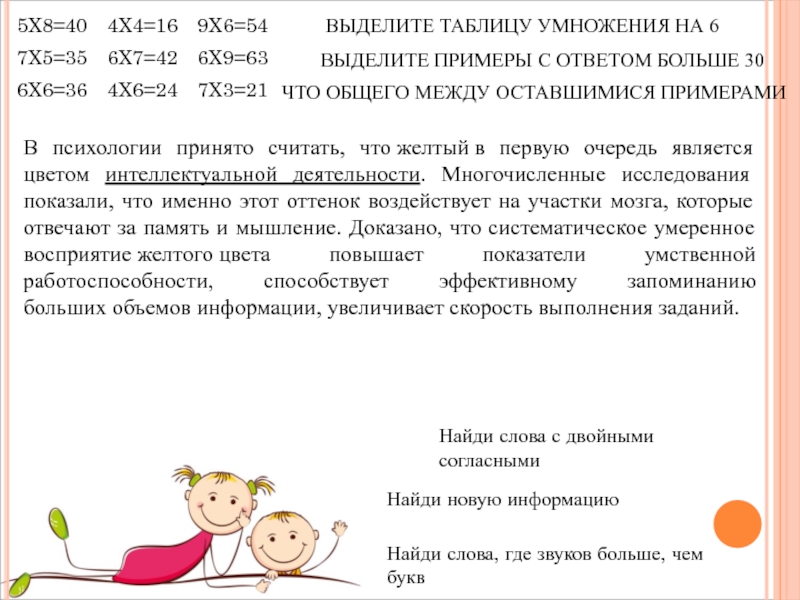 В психологии принято считать, что желтый в первую очередь является цветом интеллектуальной деятельности. Многочисленные исследования показали, что именно этот оттенок воздействует на участки мозга, которые отвечают за память и мышление. Доказано, что систематическое умеренное восприятие желтого цвета повышает показатели умственной работоспособности, способствует эффективному запоминанию больших объемов информации, увеличивает скорость выполнения заданий.