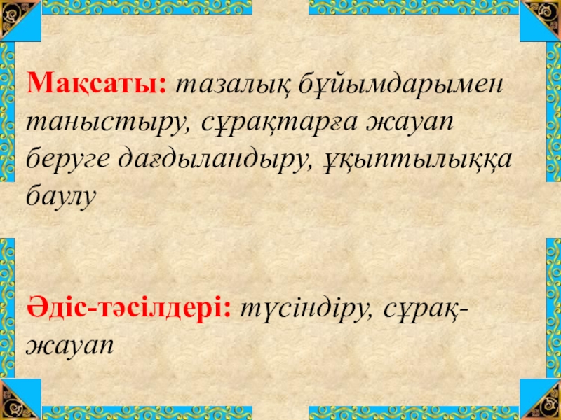 Слайд 2Мақсаты: тазалық бұйымдарымен таныстыру, сұрақтарға жауап беруге дағдыландыру, ұқыптылыққа баулу Әдіс-тәсілдері: түсіндіру,