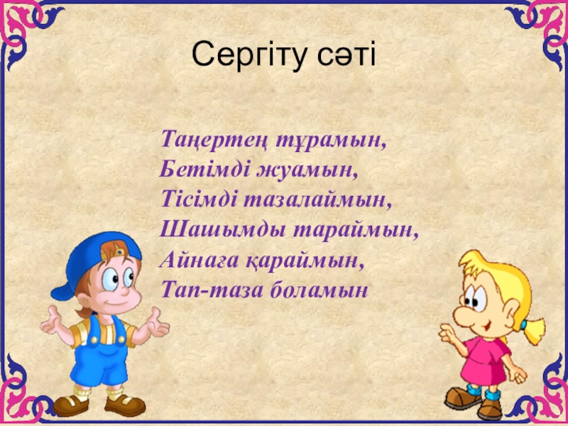 Сергіту сәтіТаңертең тұрамын,Бетімді жуамын,Тісімді тазалаймын,Шашымды тараймын,Айнаға қараймын,Тап-таза боламын