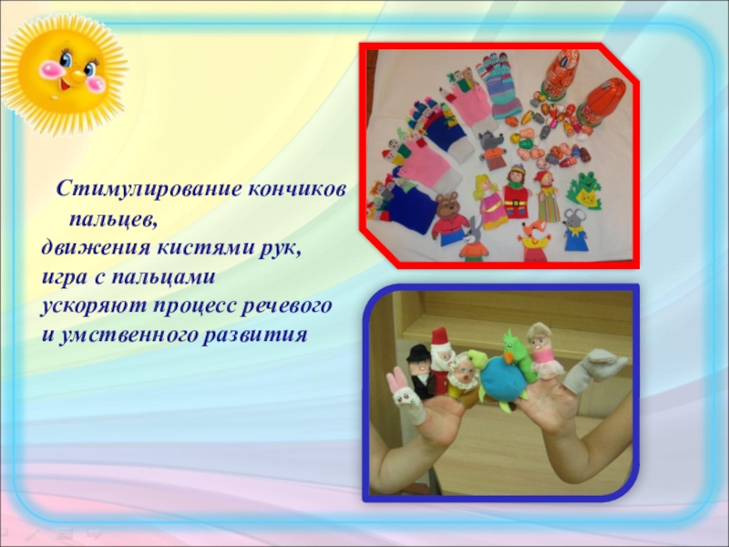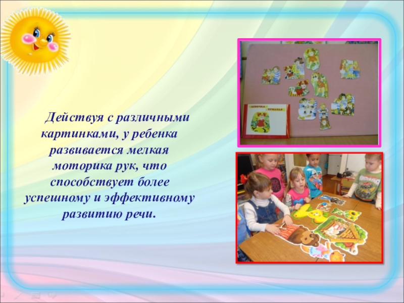 Слайд 21 Действуя с различными картинками, у ребенка развивается мелкая моторика
