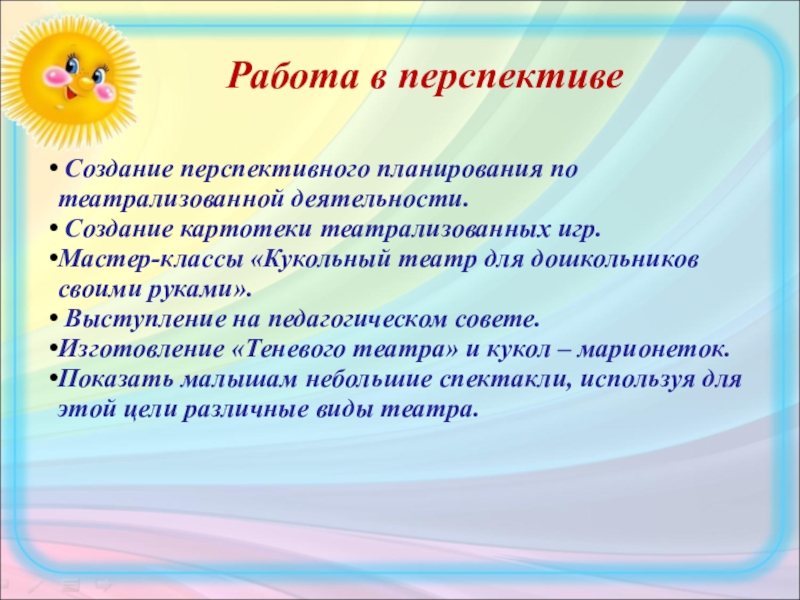 Создание перспективного планирования по театрализованной деятельности.
