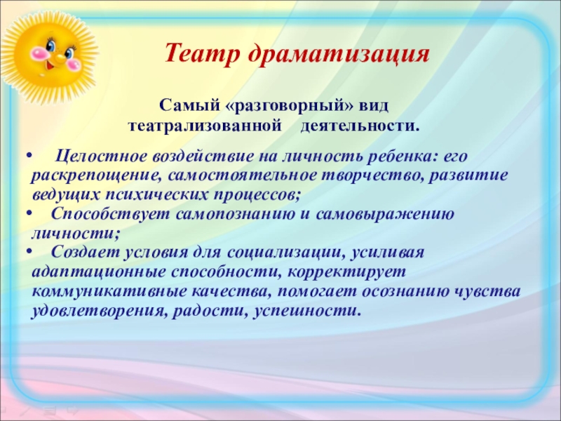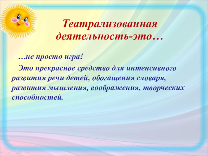 Слайд 2 Как показывает педагогический опыт, значение театрализованной деятельности для разностороннего
