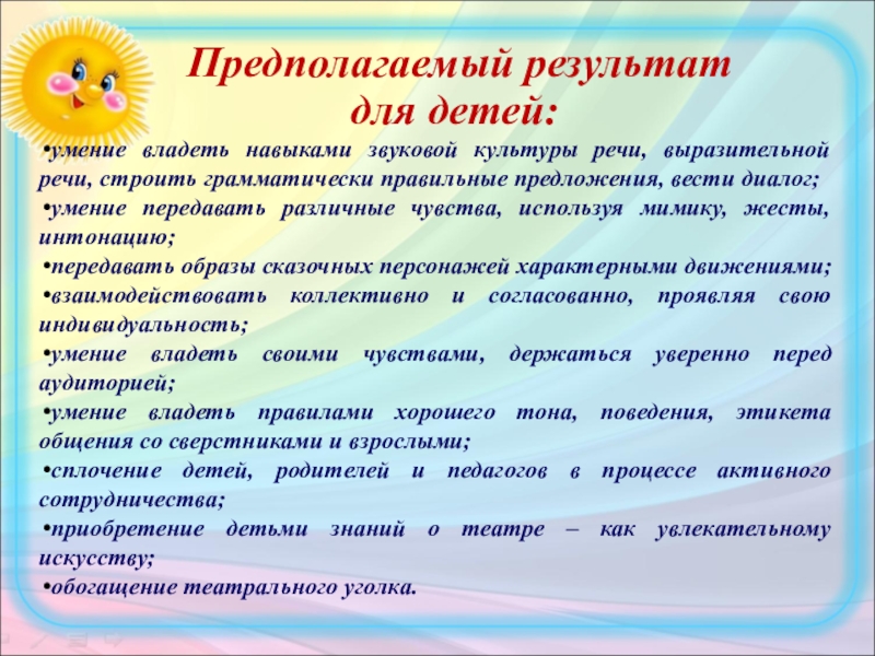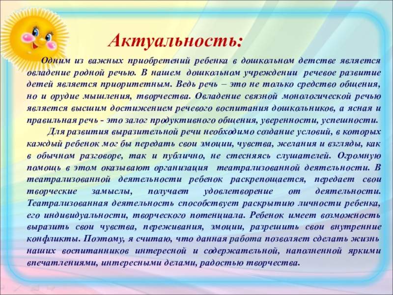 Для развития выразительной речи необходимо создание условий, в которых каждый ребенок мог бы передать свои эмоции, чувства, желания и взгляды, как в обычном разговоре, так и публично, не стесняясь слушателей. Огромную помощь в этом оказывают организация театрализованной деятельности. В театрализованной деятельности ребенок раскрепощается, передает свои творческие замыслы, получает удовлетворение от деятельности. Театрализованная деятельность способствует раскрытию личности ребенка, его индивидуальности, творческого потенциала. Ребенок имеет возможность выразить свои чувства, переживания, эмоции, разрешить свои внутренние конфликты. Поэтому, я считаю, что данная работа позволяет сделать жизнь наших воспитанников интересной и содержательной, наполненной яркими впечатлениями, интересными делами, радостью творчества.