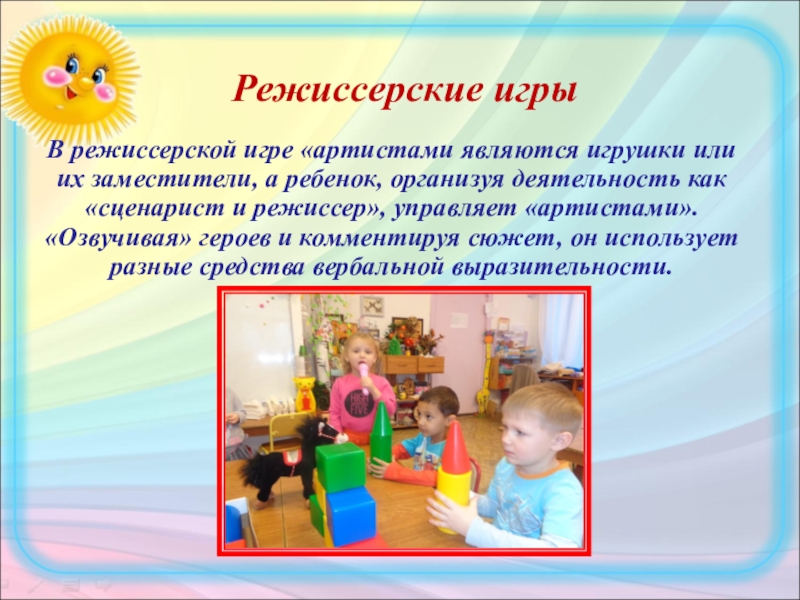 Слайд 43В режиссерской игре «артистами являются игрушки или их заместители, а ребенок,