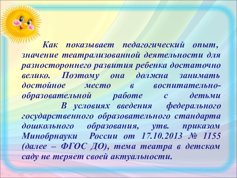 В условиях введения федерального государственного образовательного стандарта дошкольного образования, утв. приказом Минобрнауки России от 17.10.2013 № 1155 (далее – ФГОС ДО), тема театра в детском саду не теряет своей актуальности.