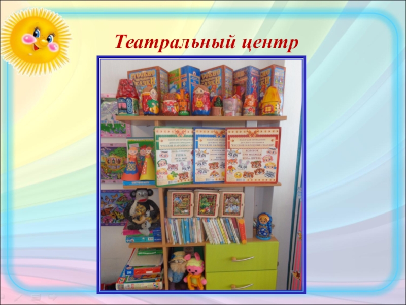 Слайд 48В театральном центре представлено разнообразное оснащение для разыгрывание сценок и спектаклей