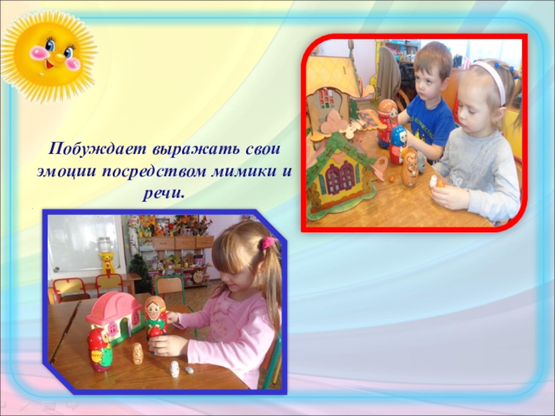 Слайд 25Побуждает выражать свои эмоции посредством мимики и речи.