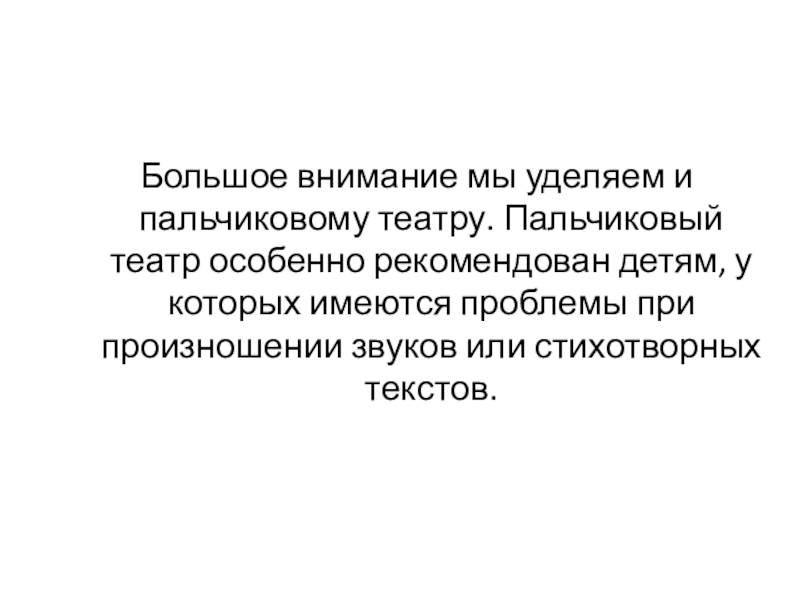 Слайд 4Большое внимание мы уделяем и пальчиковому театру. Пальчиковый театр особенно рекомендован