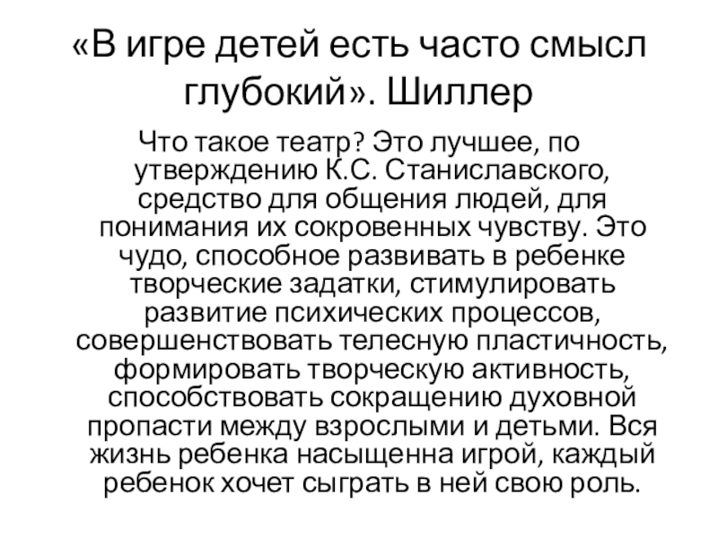 «В игре детей есть часто смысл глубокий». ШиллерЧто такое театр? Это лучшее, по утверждению К.С. Станиславского, средство