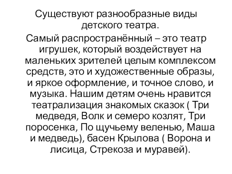 Существуют разнообразные виды детского театра. Самый распространённый – это театр игрушек, который воздействует на маленьких зрителей целым