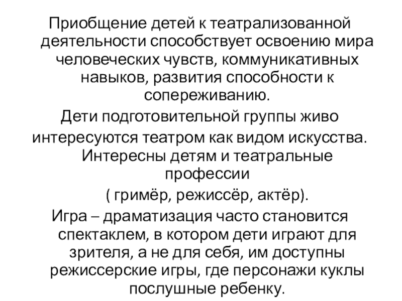 Слайд 7Приобщение детей к театрализованной деятельности способствует освоению мира человеческих чувств, коммуникативных