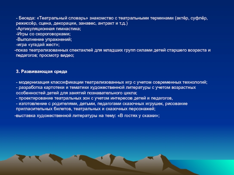 Слайд 7- Беседа: «Театральный словарь» знакомство с театральными терминами (актёр, суфлёр, режиссёр,