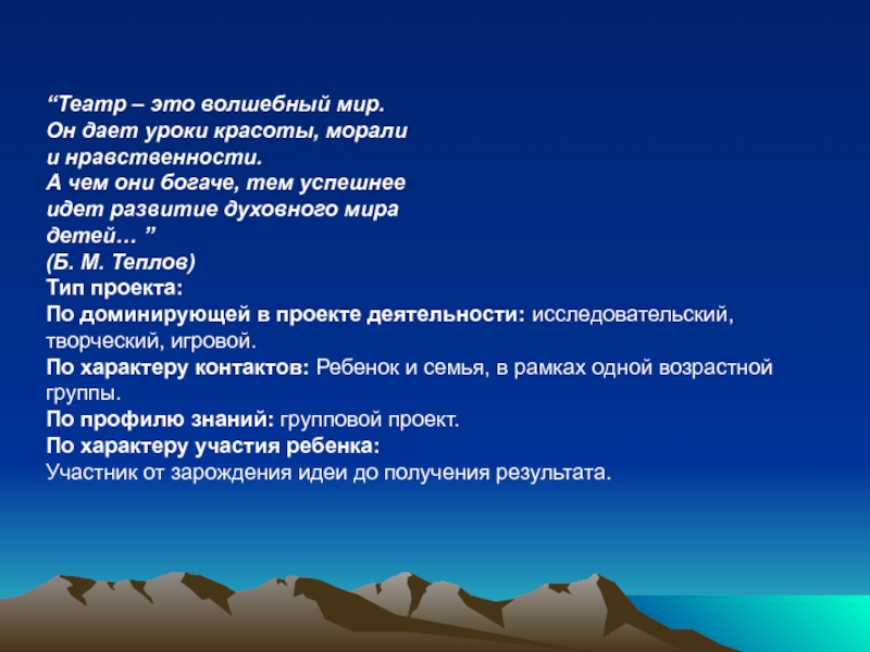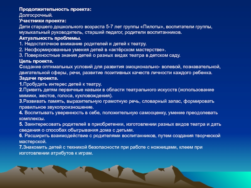 - представление опыта работы по театрализованной деятельности детей дошкольников через презентацию проекта.