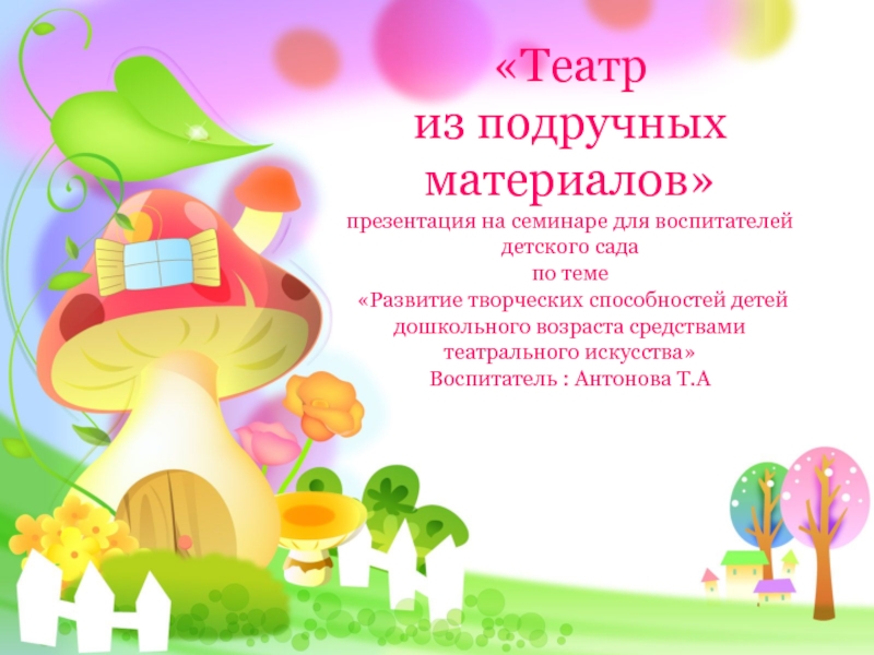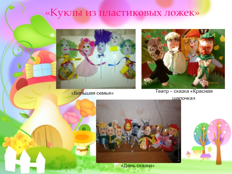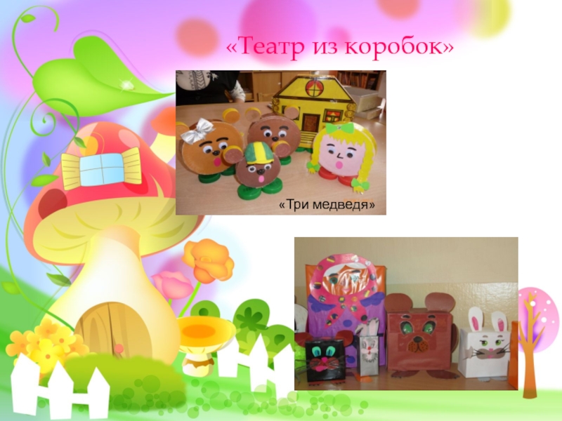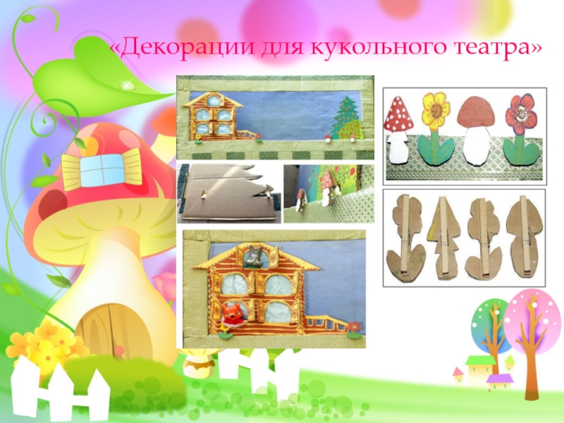11декорации для кукольного театра можно просто нарисовать на картоне и вырезать по контуру. Прикрепить такую декорацию можно с помощью обыкновенных бельевых прищепок. А чтобы прищепки не портили вид сцены, их можно замаскировать под картонную фигурку цветка, грибка, кустика.