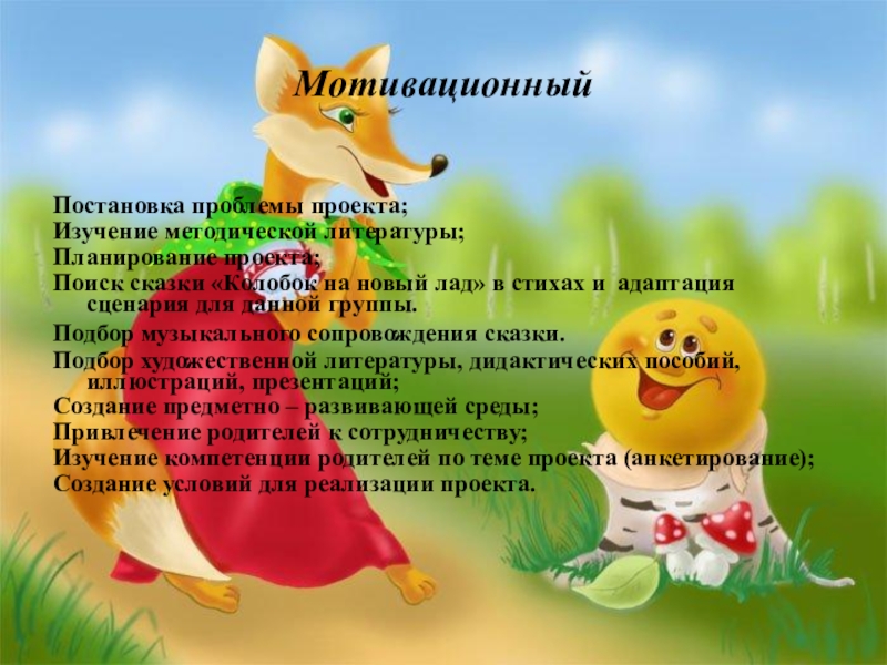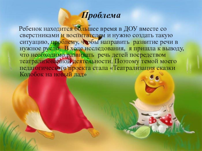 и воспитателем и нужно создать такую ситуацию, проблему, чтобы направить развитие речи в нужное русло. В ходе исследования, я пришла к выводу, что необходимо развивать речь детей посредством театрализованной деятельности. Поэтому темой моего педагогического проекта стала «Театрализация сказки Колобок на новый лад»