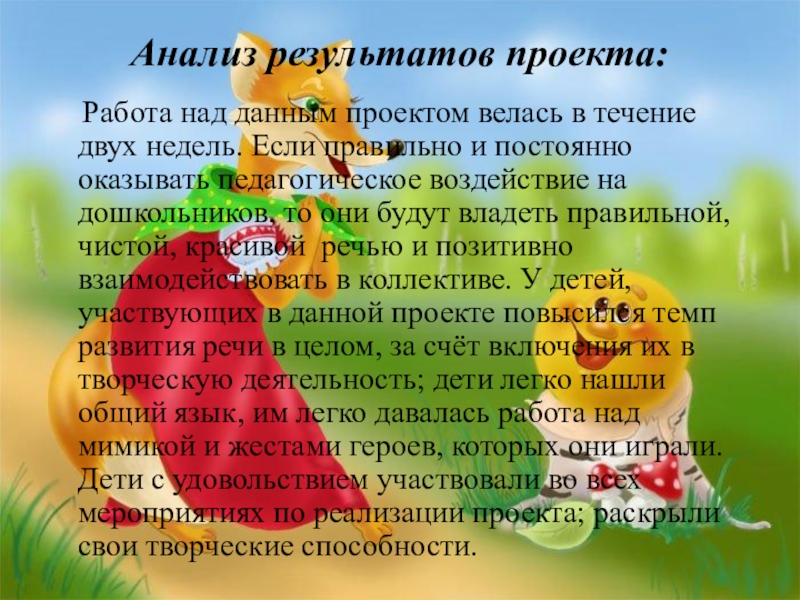 течение двух недель. Если правильно и постоянно оказывать педагогическое воздействие на дошкольников, то они будут владеть правильной, чистой, красивой речью и позитивно взаимодействовать в коллективе. У детей, участвующих в данной проекте повысился темп развития речи в целом, за счёт включения их в творческую деятельность; дети легко нашли общий язык, им легко давалась работа над мимикой и жестами героев, которых они играли. Дети с удовольствием участвовали во всех мероприятиях по реализации проекта; раскрыли свои творческие способности.
