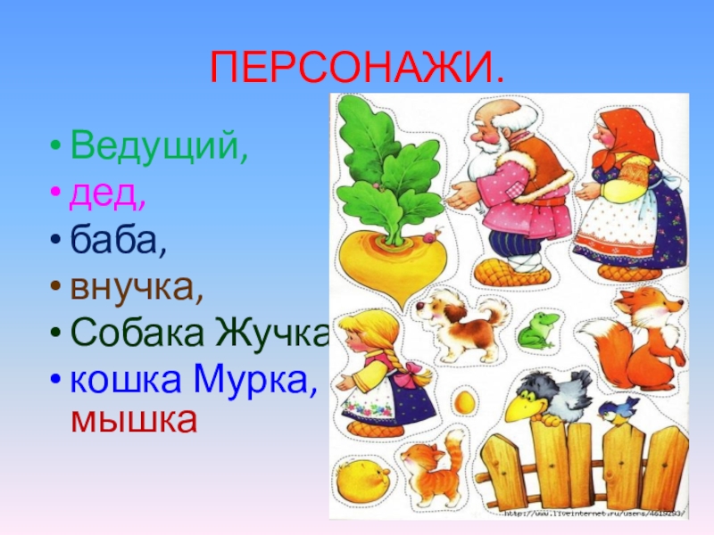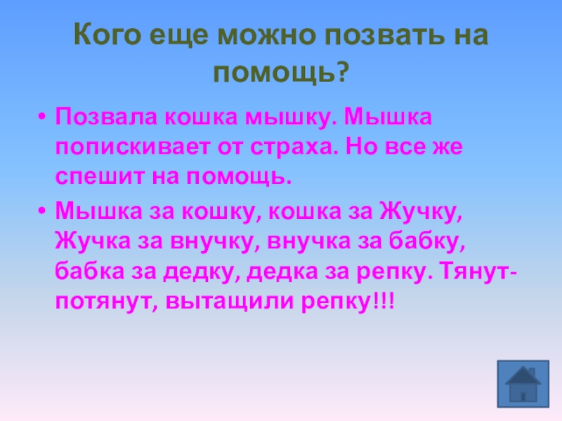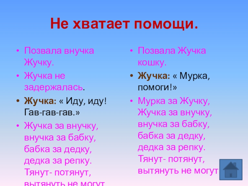 Мурка за Жучку, Жучка за внучку, внучка за бабку, бабка за дедку, дедка за репку. Тянут- потянут, вытянуть не могут.