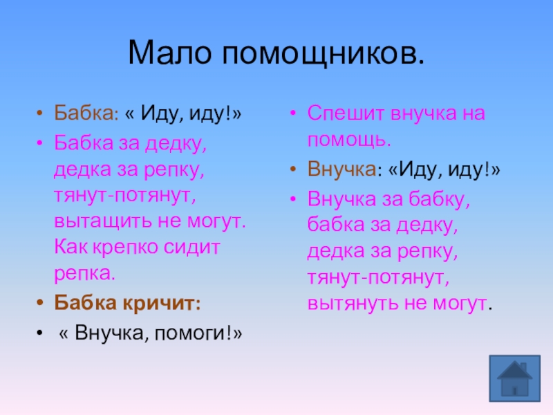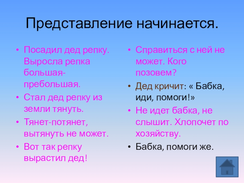 Внучка за бабку, бабка за дедку, дедка за репку, тянут-потянут, вытянуть не могут.