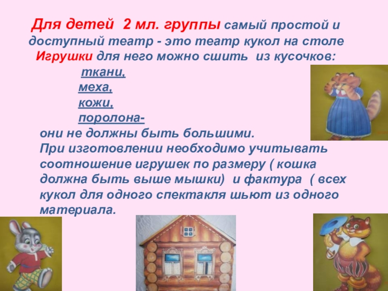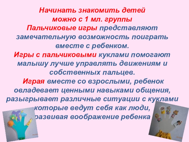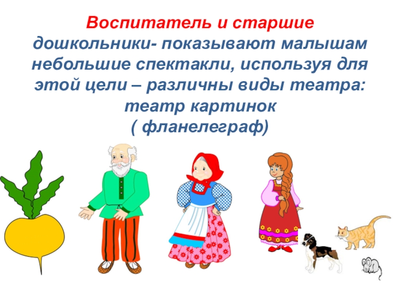 Слайд 24Воспитатель и старшие дошкольники- показывают малышам небольшие спектакли, используя для этой