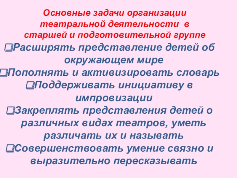 Основные задачи организации театральной деятельности в старшей и подготовительной группе
