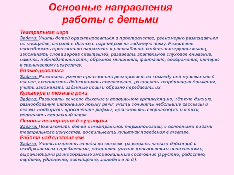равномерно размещаться по площадке, строить диалог с партнёром на заданную тему. Развивать способность произвольно напрягать и расслаблять отдельные группы мышц, запоминать слова героев спектаклей, развивать зрительное слуховое внимание, память, наблюдательность, образное мышление, фантазию, воображение, интерес к сценическому искусству.