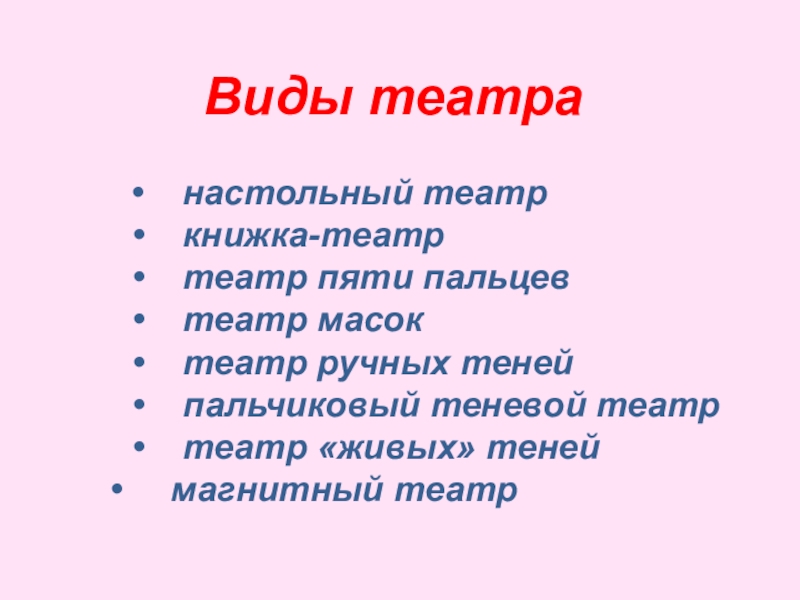 - различные виды театров: бибабо, настольный, театр на фланелеграфе и др.;