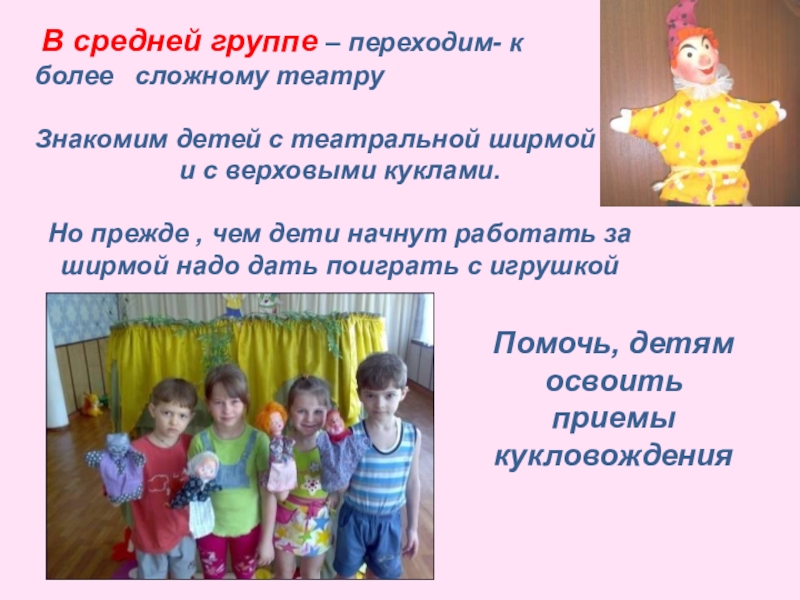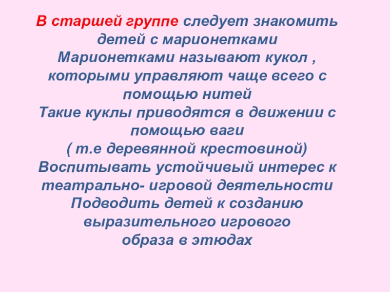 Слайд 27В старшей группе следует знакомить детей с марионетками