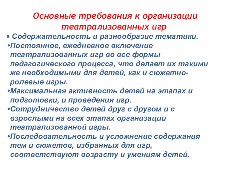 театрализованных игр во все формы педагогического процесса, что делает их такими же необходимыми для детей, как и сюжетно-ролевые игры.