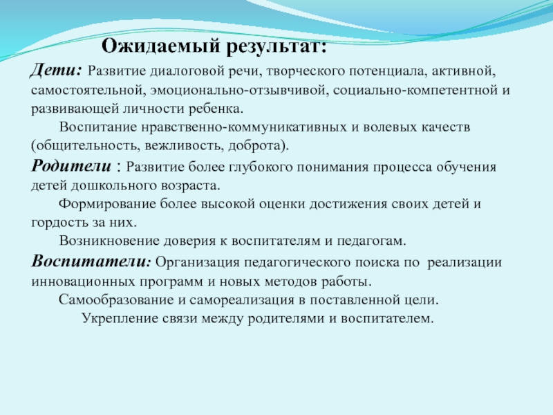 речи, творческого потенциала, активной, самостоятельной, эмоционально-отзывчивой, социально-компетентной и развивающей личности ребенка.