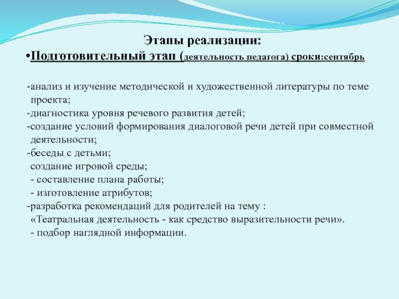 Подготовительный этап (деятельность педагога) сроки:сентябрь