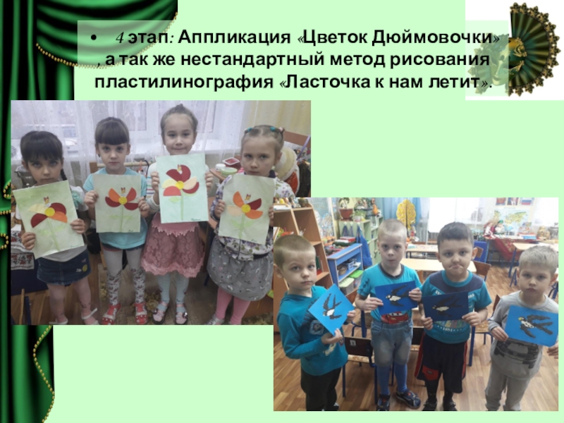 •	4 этап: Аппликация «Цветок Дюймовочки» , а так же нестандартный метод рисования пластилинография «Ласточка к нам летит».
