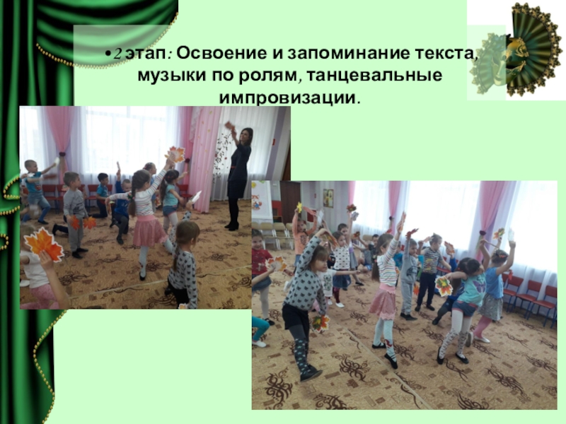 Слайд 14•2 этап: Освоение и запоминание текста, музыки по ролям, танцевальные импровизации.
