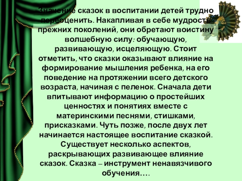 Слайд 2Значение сказок в воспитании детей трудно переоценить. Накапливая в себе мудрость
