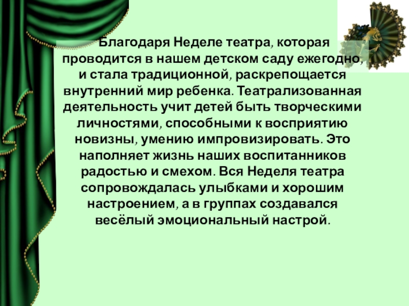 Слайд 24 Благодаря Неделе театра, которая проводится в нашем детском саду ежегодно,