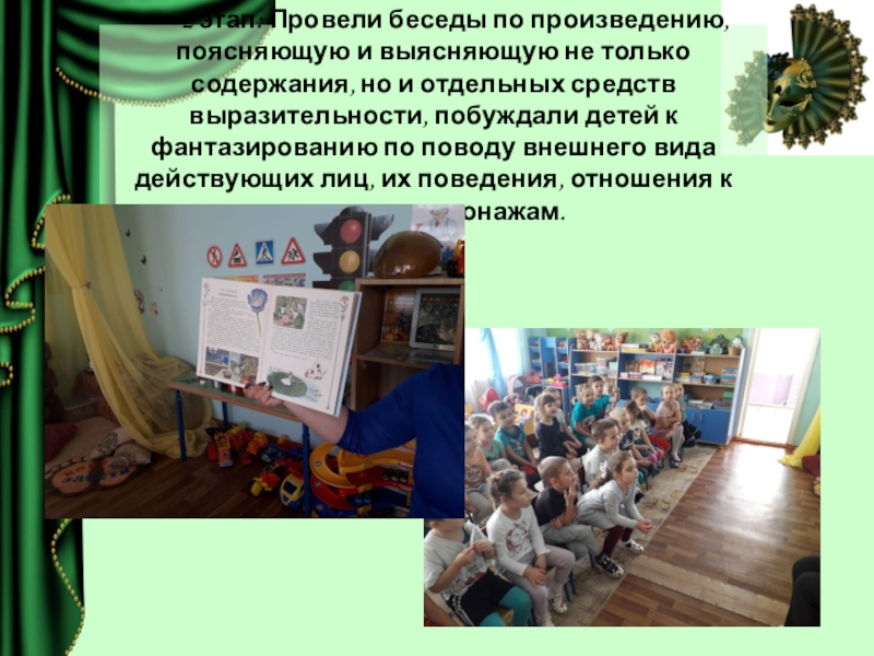 Слайд 6• 2 этап: Провели беседы по произведению, поясняющую и выясняющую не только