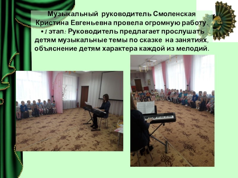 Слайд 13Музыкальный руководитель Смоленская Кристина Евгеньевна провела огромную работу. •1 этап: Руководитель
