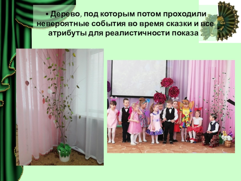 • Дерево, под которым потом проходили невероятные события во время сказки и все атрибуты для реалистичности показа