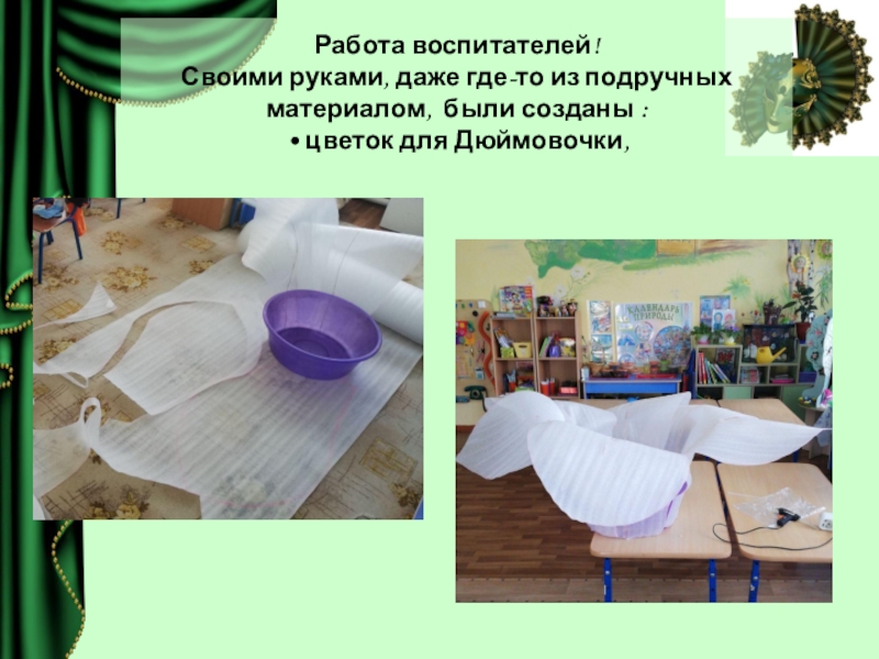 Работа воспитателей! Своими руками, даже где-то из подручных материалом, были созданы : • цветок для Дюймовочки,