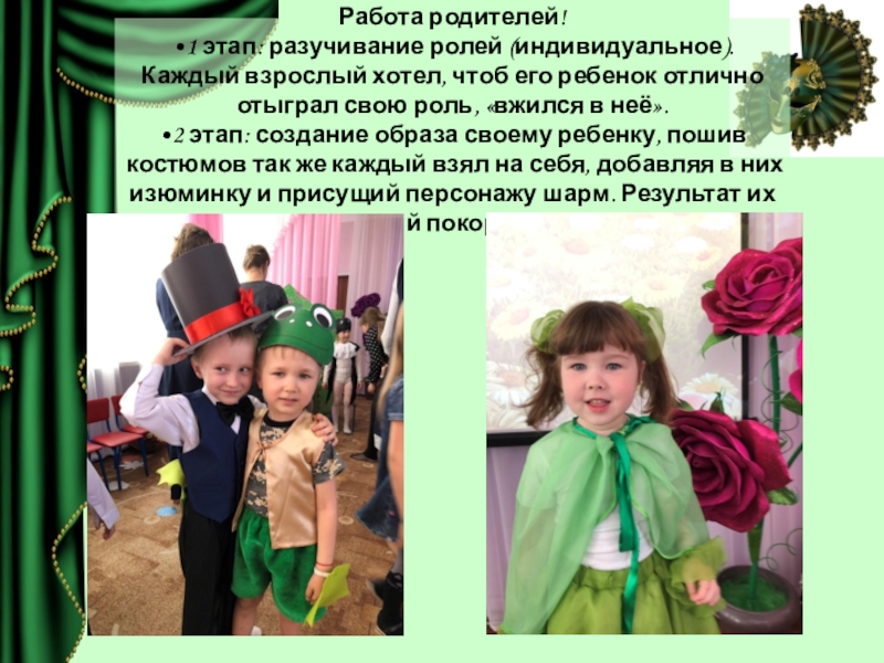 Работа родителей! •1 этап: разучивание ролей (индивидуальное).Каждый взрослый хотел, чтоб его ребенок отлично отыграл свою роль, «вжился